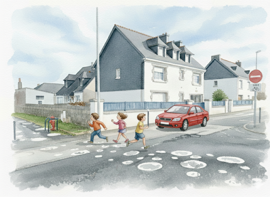 - Dégager la visibilité : Ce changement de flux permettrait aux conducteurs d’avoir une vue dégagée sur le cheminement piétonnier devant la salle Queffélec. Un simple marquage au sol et quelques panneaux suffiraient à sécuriser les enfants.