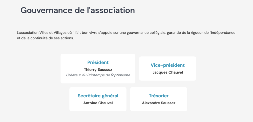 Donc on retrouve à la direction de cette association porteuse du fameux label, Thierry Saussez. En trésorier, Alexandre Saussez qui est également trésorier de la Ligue des optimistes, et était bien sûr partie prenante dans le printemps de l’optimisme.