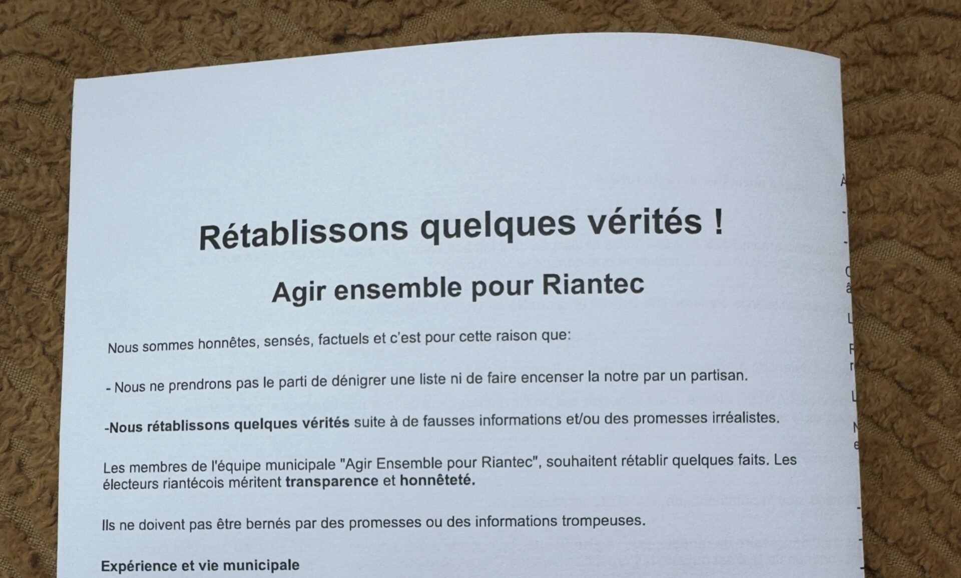 Je ne comprends pas ce qui a poussé la liste « Agir ensemble pour Riantec » à écrire ce texte qui confirme point par point leur incapacité à faire un constat honnête de la situation pour pouvoir progresser. La gestion communale est un exercice très difficile et il est normal de faire des erreurs, et ceux qui s’y collent ont beaucoup de mérite. Je crois que nous pouvons tous en convenir.