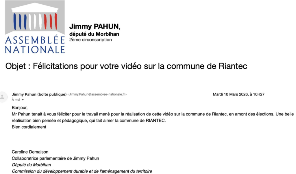 Hors le véritable moteur de cette liste »Riantec en commun » n’est pas sa tête affichée mais Nastasia Dufour, belle-fille de Jimmy Pahun. Qu’un député soutienne une liste de son parti, ça se conçoit. Mais là ? Il soutient un membre de sa famille en utilisant sa fonction d’état. Pourquoi n’a-t-il pas envoyé un message de félicitations lui-même en son nom propre ?